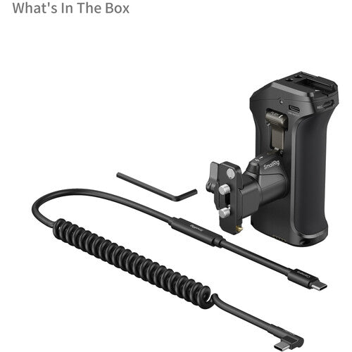 A record/stop trigger button lets you control the camera REC function. Included with the handle is a USB-C control cable that connects select Canon EOS and Blackmagic Design cameras. The top of the handle features 1/4"-20 threads and a shoe mount for adding a light, microphone, monitor, mounting arm, or other accessories. The handle features a nonslip silicone grip and includes an Allen wrench that can be stored within the handle.